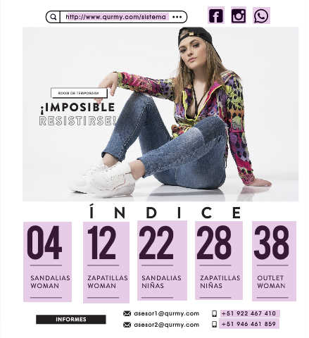 http://www.qurmy.com/sistema BOOM DE TEMPORADA ¡IMPOSIBLE Í N D I C E 04 12 22 28 38 SANDALIAS ZAPATILLAS SANDALIAS ZAPATILLAS OUTLET WOMAN WOMAN NIÑAS NIÑAS WOMAN asesor1@qurmy.com +51 922 467 410 INFORMES asesor2@qurmy.com +51 946 461 859